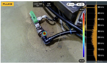 検査中は機械の稼働音や加工音が絶えない中でも、FLUKE社製の超音波カメラなら、カメラをかざすだけでエア漏れ特有の音だけを正確に拾い、画面上に色で示してくれるので、作業を止めることなく効率的な調査が可能です。