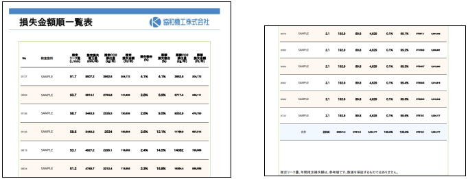 協和機工では、漏れ箇所ごとに年間の損失金額を算出し、金額の大きい順に並べたレポートをお渡ししています。