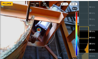 超音波カメラは、人の耳には聞こえない高周波の音(超音波)を検知し、漏れの位置を画面上に色で可視化してくれます。当社が使っているFLUKE社の超音波カメラは、周囲の騒音を自動でフィルタリングし、エア漏れの周波数だけを抽出する機能を備えているため、機械がフル稼働している状態でも正確な検査が可能です。