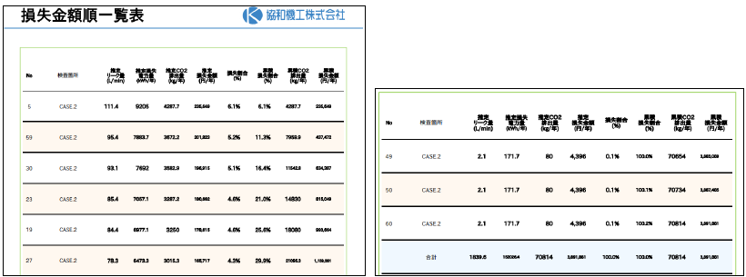 協和機工が提供するエア漏れ検査サービスでは、検出した漏れ箇所ごとに年間の金銭的損失を算出し、それを大きい順に整理したレポートをご提出しています。