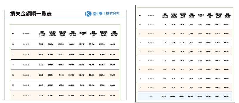 実際、当社の検査でもこの機能を活用して、漏れ箇所を損失金額順に並べたレポートをお渡ししており、お客様から「修繕の優先順位が一目でわかる」とご好評をいただいています。