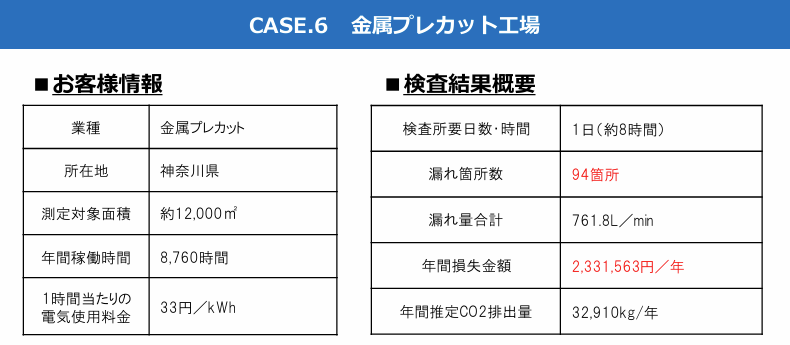 神奈川県のある工場では、実に94箇所のエア漏れ箇所があり、年間損失額は約230万円と非常に大きい額でした。
