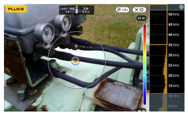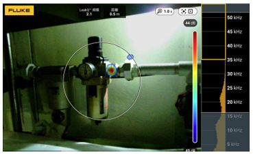 当社が使用するFLUKE社の超音波カメラは、空気中に発生する超音波を可視化するため、高所でも非接触で漏れ箇所の特定が可能です。そのため天井付近の高所配管でも、ガス漏れを画面上に「視覚的に」表示できます。高所に登らなくても地上から検査ができるため、作業者の安全性が大幅に向上します。