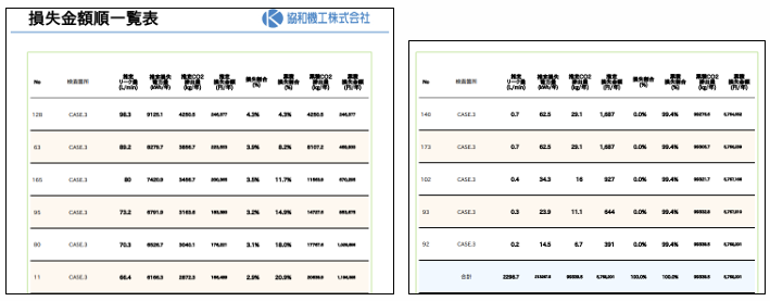 さらに「エア漏れ検査サービス」では、漏れ箇所を損失金額順に一覧にしてお渡しするサービスも提供しています。損失の多い箇所から修繕できるため、効果的な修繕が可能となります。