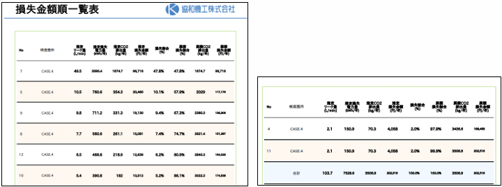 当社のエア漏れ検査サービスでは、検査結果をもとに各漏れ箇所の漏れ量・損失金額を明記したレポートをご提供しています。