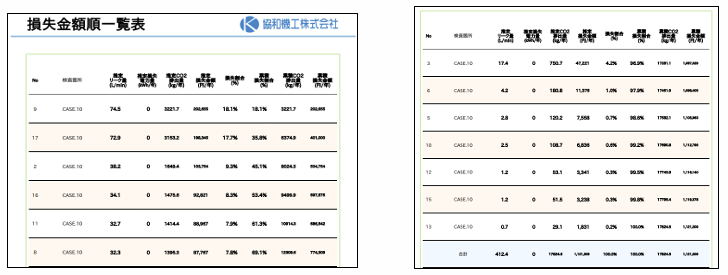 当社のエア漏れ検査サービスでは、検査結果をもとに各漏れ箇所の漏れ量・損失金額を明記したレポートをご提供しています。特に、漏れ箇所を損失金額順に並べることで、修繕の優先順位づけが容易になり、限られた予算や時間の中で最大の効果を得ることが可能です。このアプローチは、お客様からも「効率的な修繕計画が立てられる」と好評をいただいております。