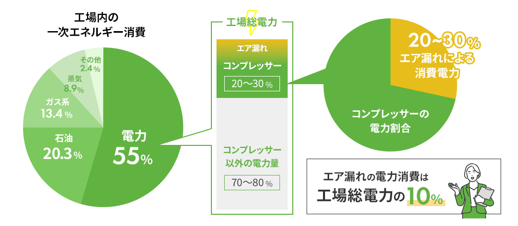 電気代が高い | 使用電力の異常を可視化 | エア漏れの可能性を示唆 |