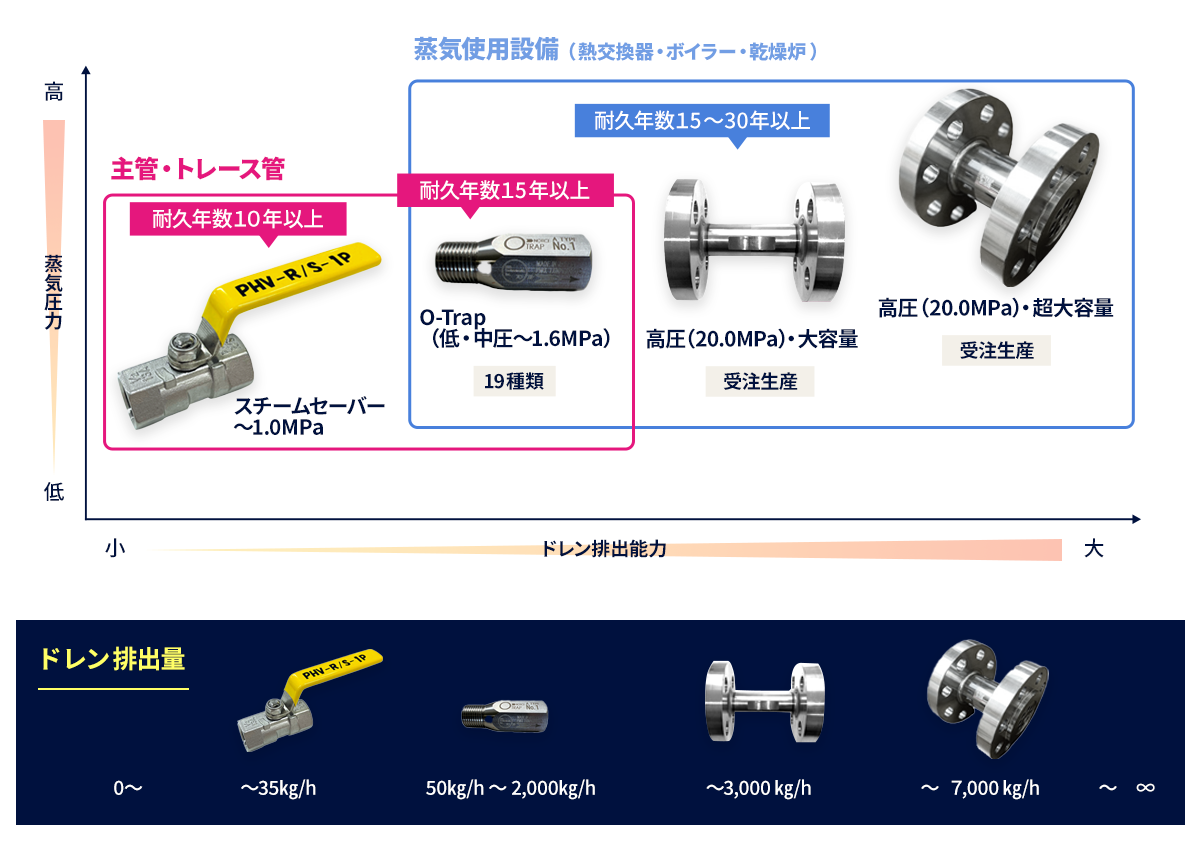 蒸気使用設備については蒸気使用量に応じO-Trap各種を取り揃えております。