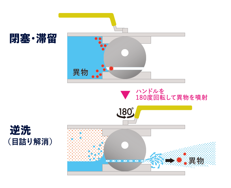 内部に異物が溜まりにくく、万一の閉塞もブロー・逆洗で解消。