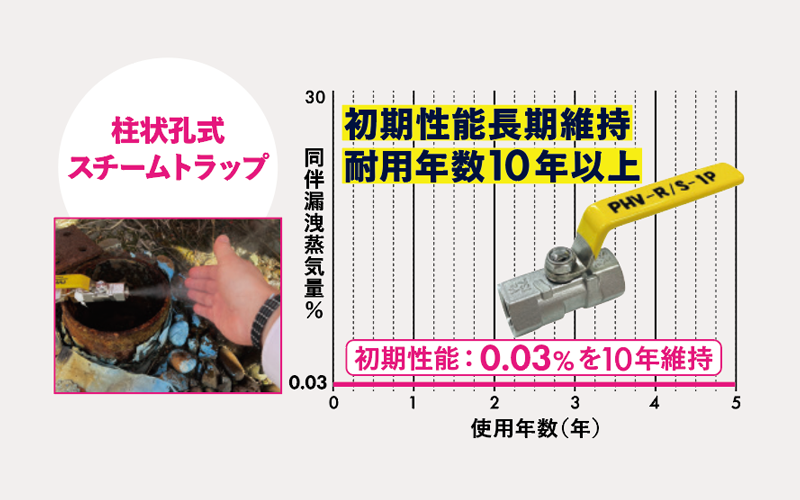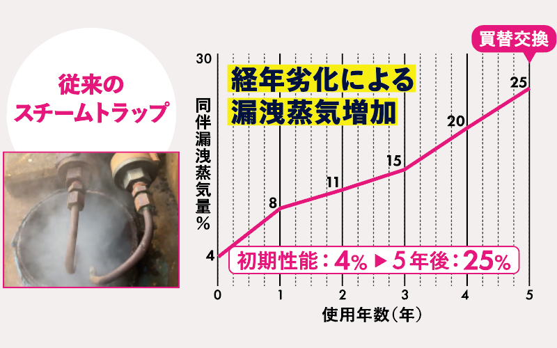 経年劣化による蒸気漏洩が発生しないため、長期間にわたって安定した省エネ効果を発揮します。