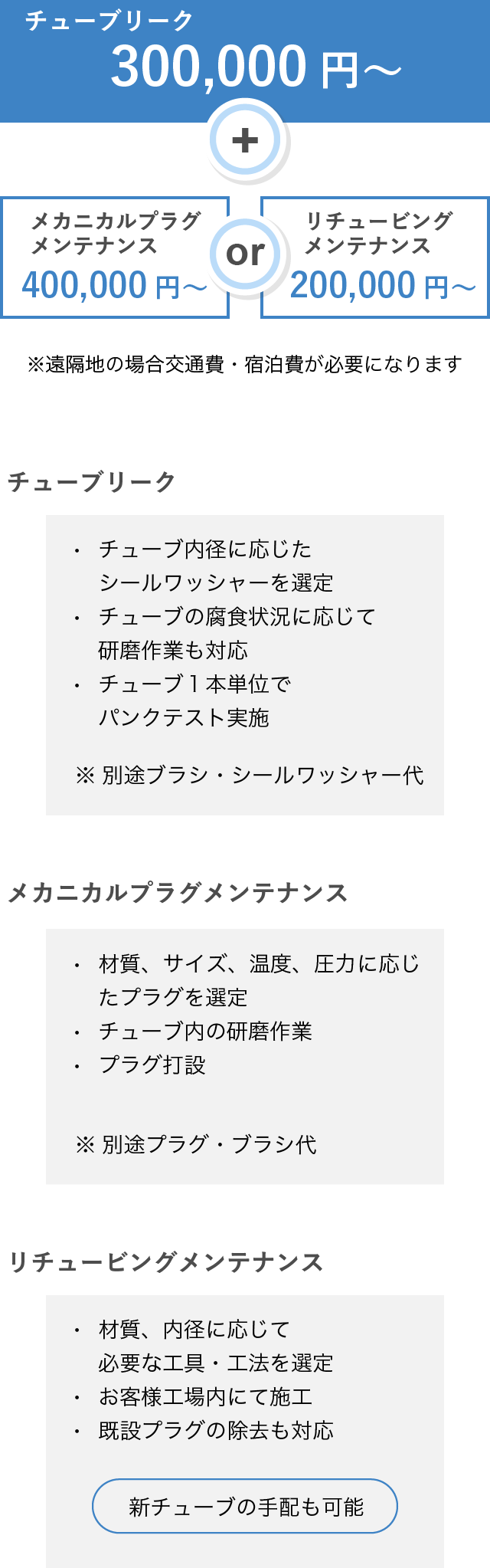 状態の悪いチューブを新品のチューブに交換するリチュービングで、熱交換器の性能を損ねることなく1本単位で補修できます。材質・内径に応じて必要な工具・工法を選定します。